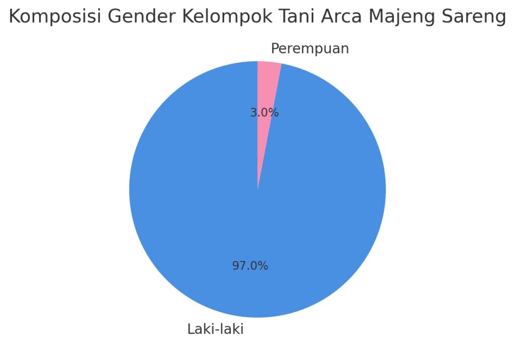 Dari sisi komposisi gender, hampir seluruh anggota adalah laki-laki (±97%), dengan keterlibatan perempuan yang sangat kecil (±3%). Hal ini menunjukkan dominasi laki-laki dalam kegiatan pertanian di kelompok ini, sementara peran perempuan masih terbatas.